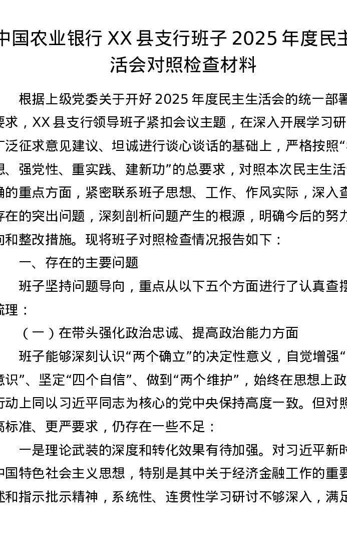 银行XX县支行班子2025年度xxxxx对照检查材料(7099字)
