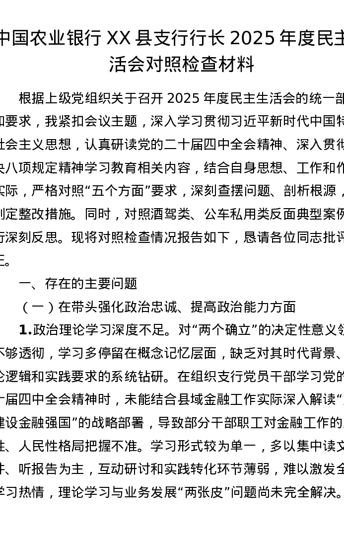 银行XX县支行行长2025年度xxxxx对照检查材料(6670字)