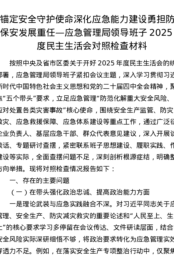 应急管理局领导班子2025年度xxxxx对照检查材料—锚定安全守护使命 深化应急能力建设 勇担防险保安发展重任