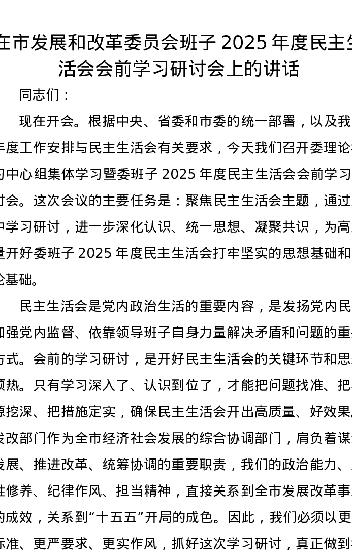 在市发展和改革委员会班子2025年度xxxxx会前学习研讨会上的讲话
