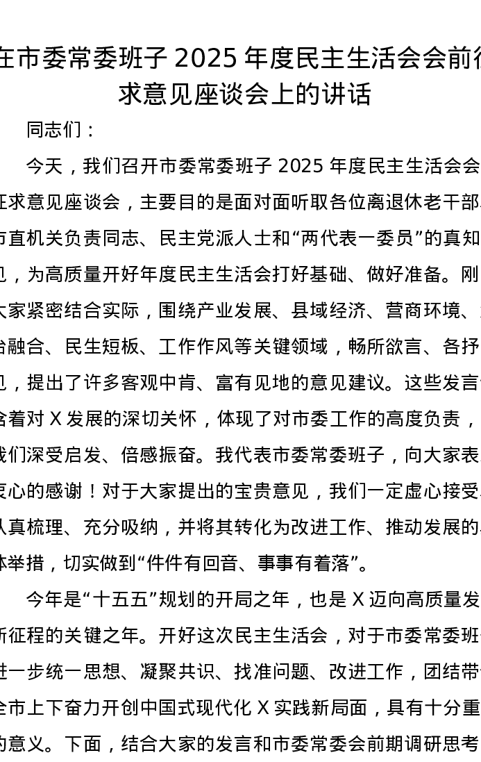 在市委常委班子2025年度xxxxx会前征求意见座谈会上的讲话