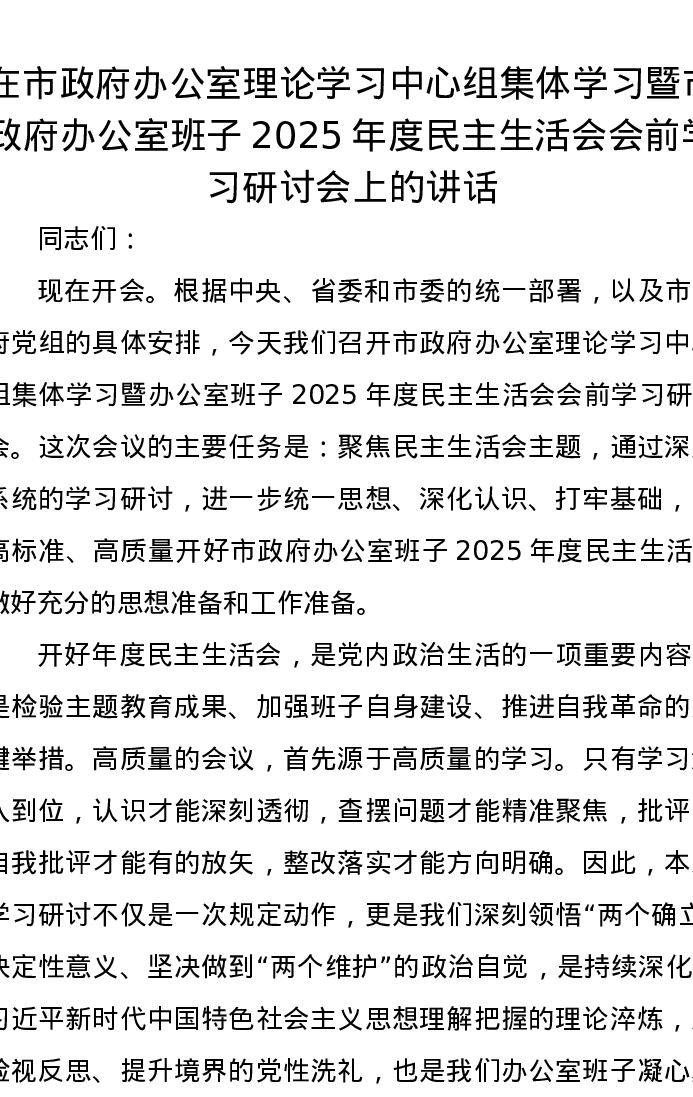 在市政府办公室理论学习中心组集体学习暨市政府办公室班子2025年度xxxxx会前学习研讨会上的讲话