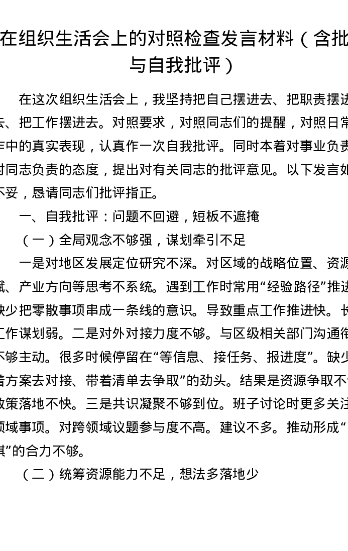 在组织xxx上的对照检查发言材料(含批评与自我批评)