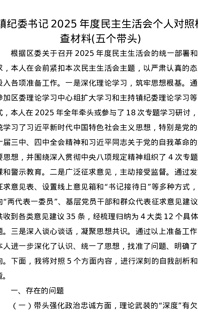 镇纪委书记2025年度xxxxx个人对照检查材料(五个带头)
