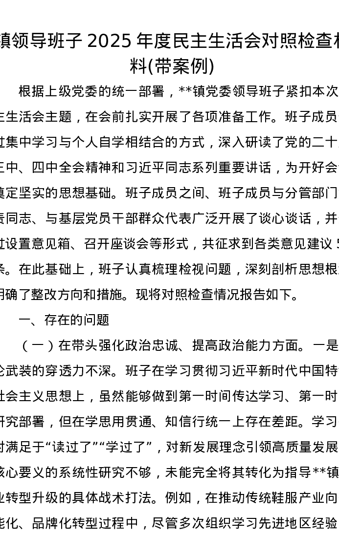 镇领导班子2025年度xxxxx对照检查材料(带案例)