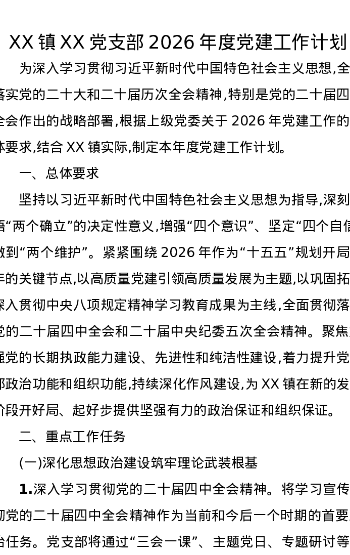 XX镇XX党支部2026年度党建工作计划