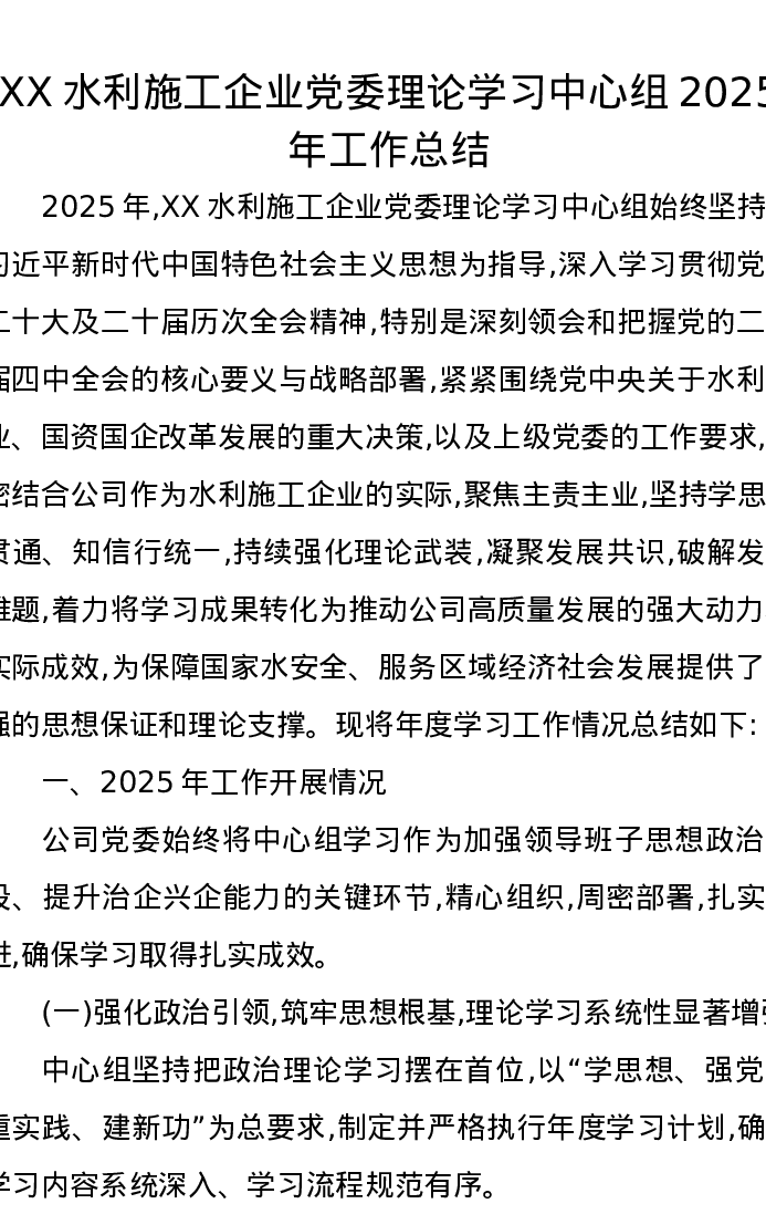 XX水利施工企业党委理论学习中心组2025年工作总结