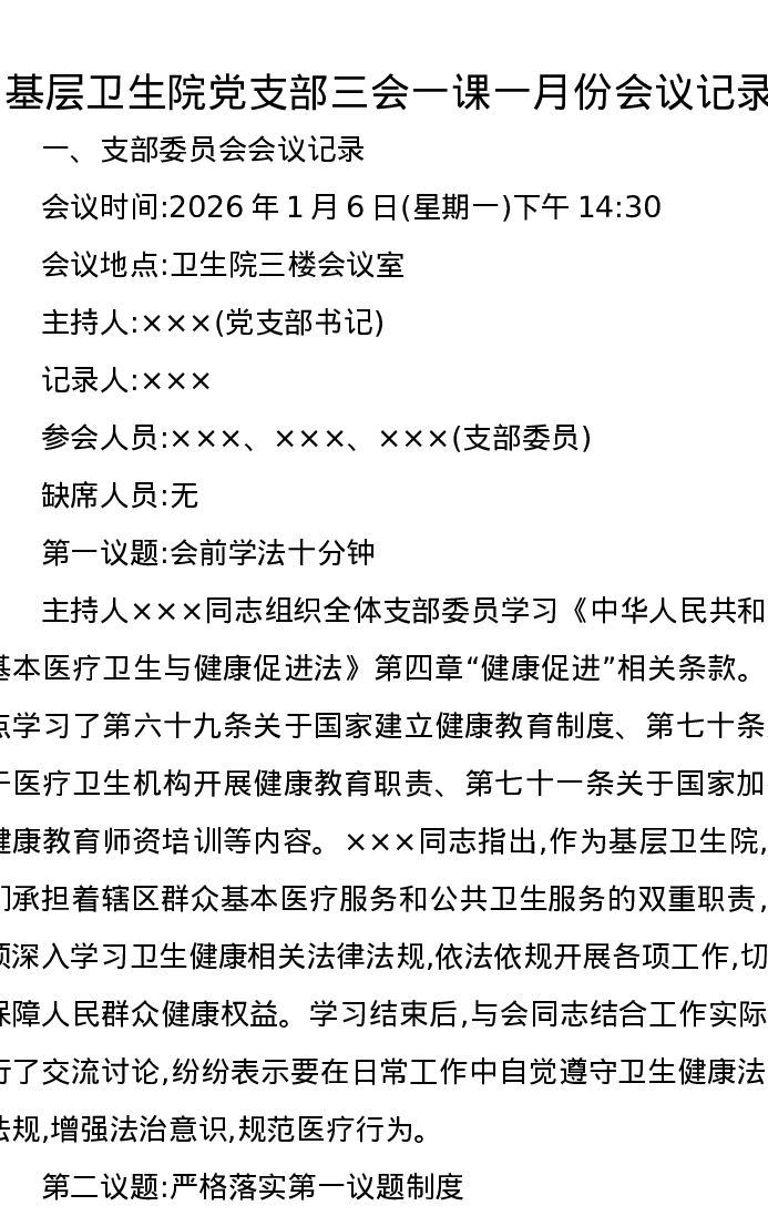 基层卫生院党支部三会一课一月份会议记录