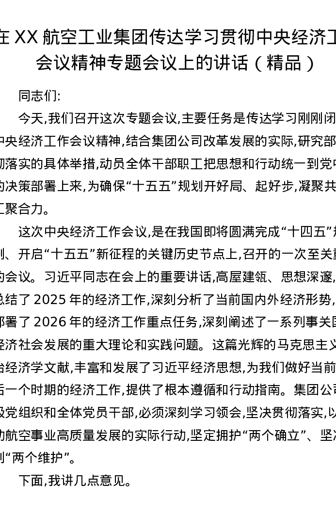 在XX航空工业集团传达学习贯彻中央经济工作会议精神专题会议上的讲话