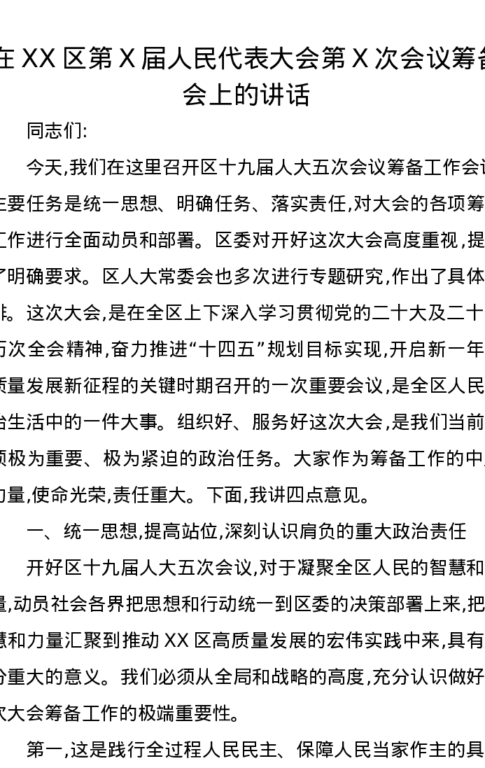 在XX区第X届人民代表大会第X次会议筹备会上的讲话