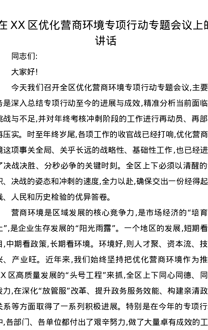 在XX区优化营商环境专项行动专题会议上的讲话