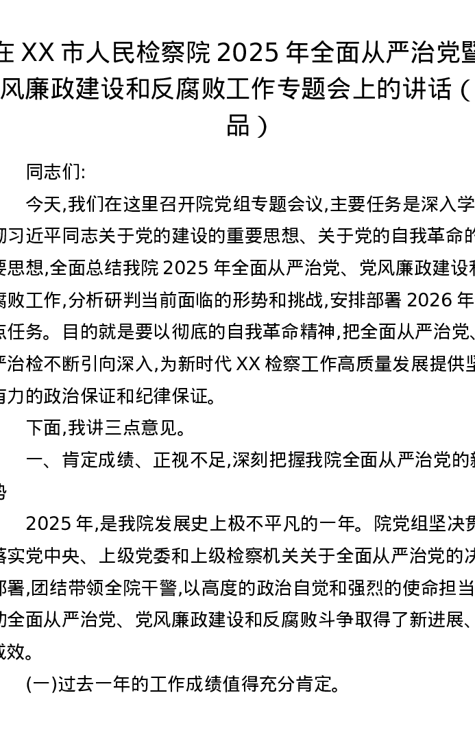 在XX市人民检察院2025年全面从严治党暨党风廉政建设和反腐败工作专题会上的讲话