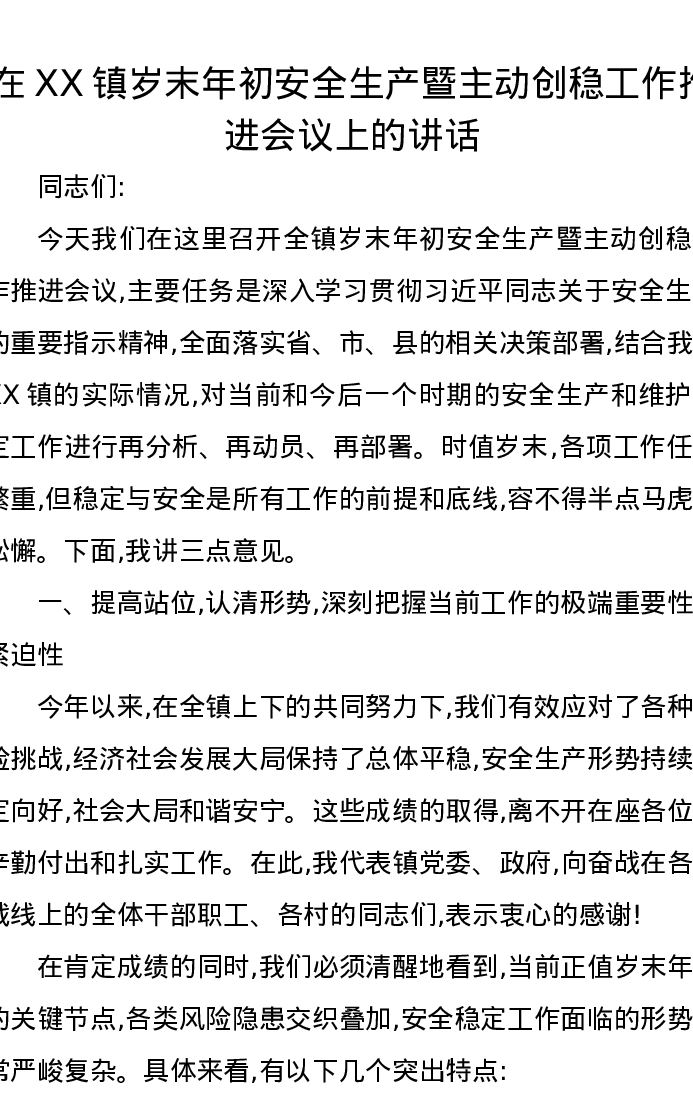 在XX镇岁末年初安全生产暨主动创稳工作推进会议上的讲话