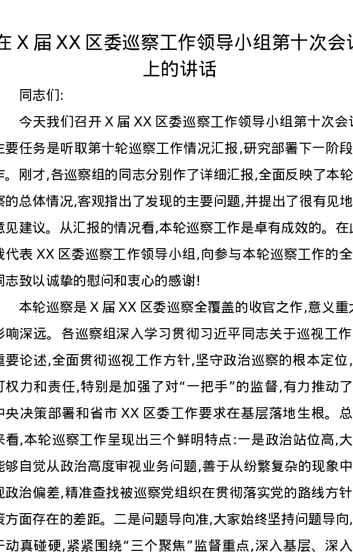 在X届XX区委巡察工作领导小组第十次会议上的讲话