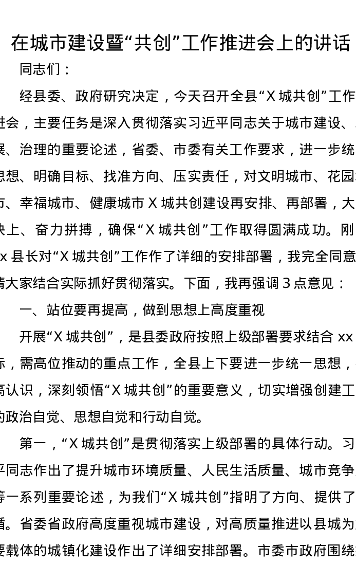 在城市建设暨共创工作推进会上的讲话