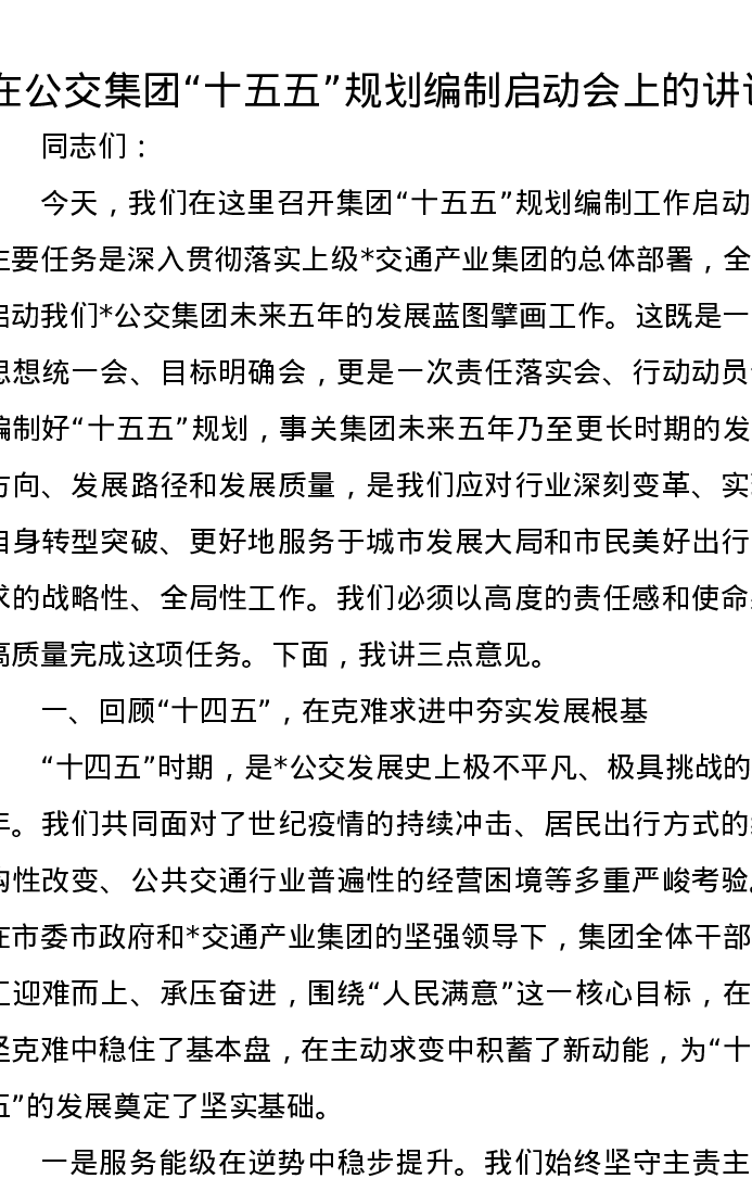 在公交集团十五五规划编制启动会上的讲话