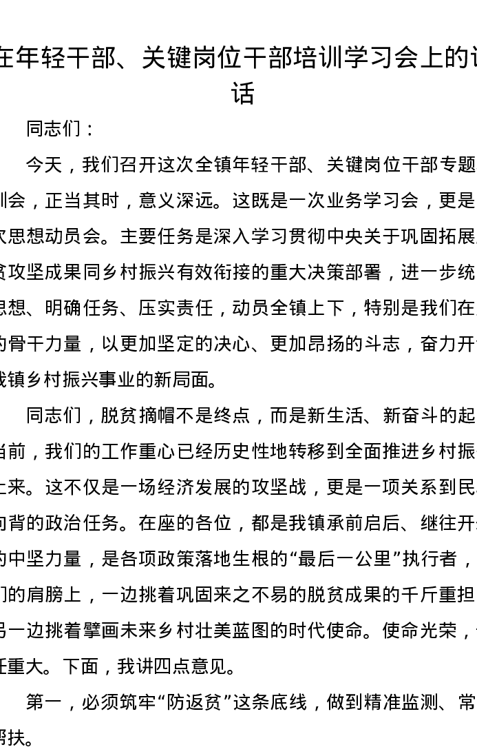 在年轻干部、关键岗位干部培训学习会上的讲话