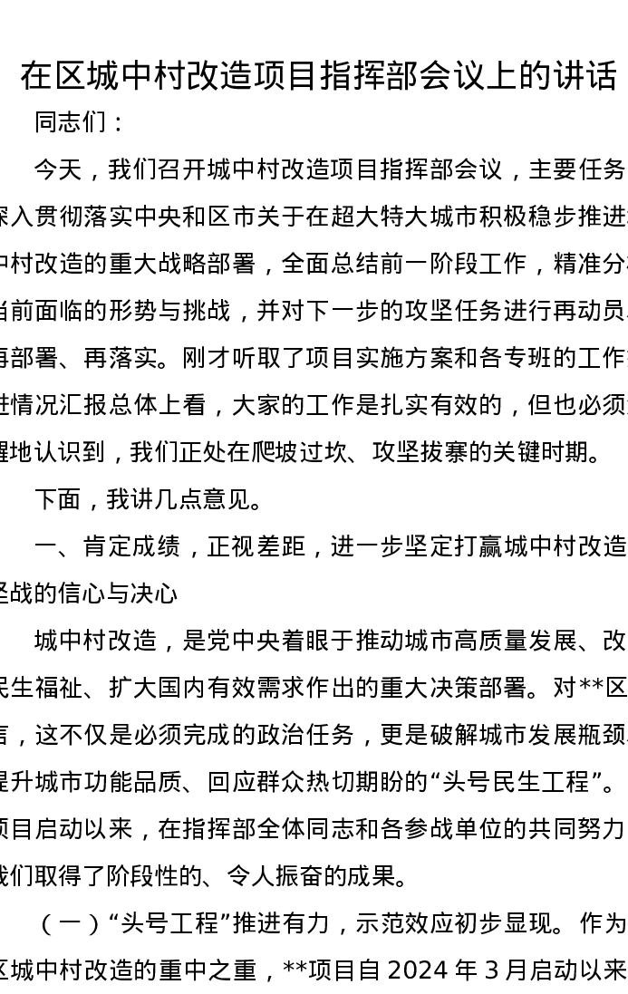 在区城中村改造项目指挥部会议上的讲话