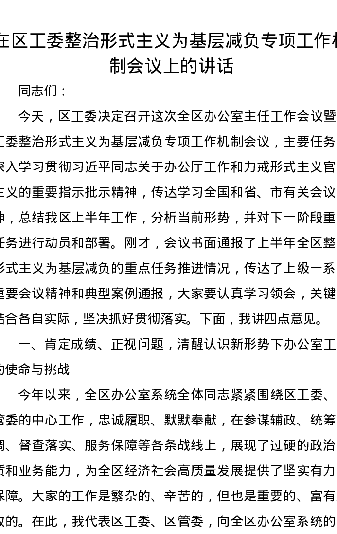 在区工委整治形式主义为基层减负专项工作机制会议上的讲话