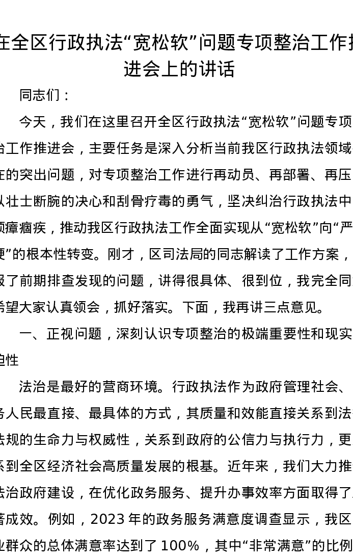 在全区行政执法宽松软问题专项整治工作推进会上的讲话