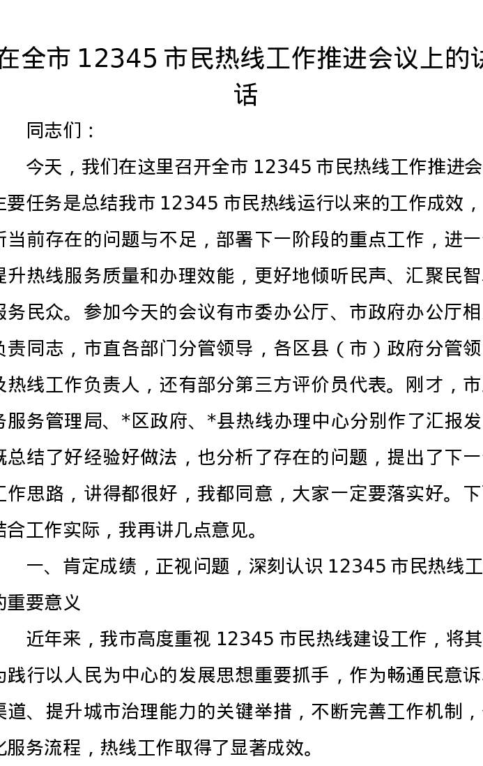 在全市12345市民热线工作推进会议上的讲话
