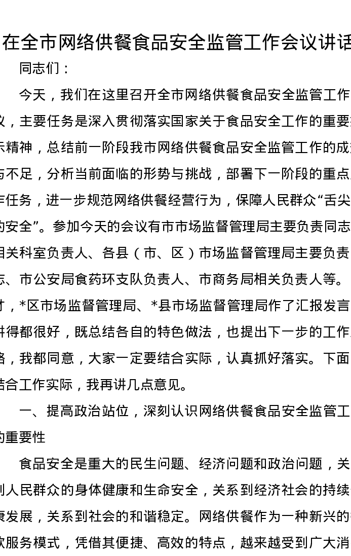 在全市网络供餐食品安全监管工作会议讲话