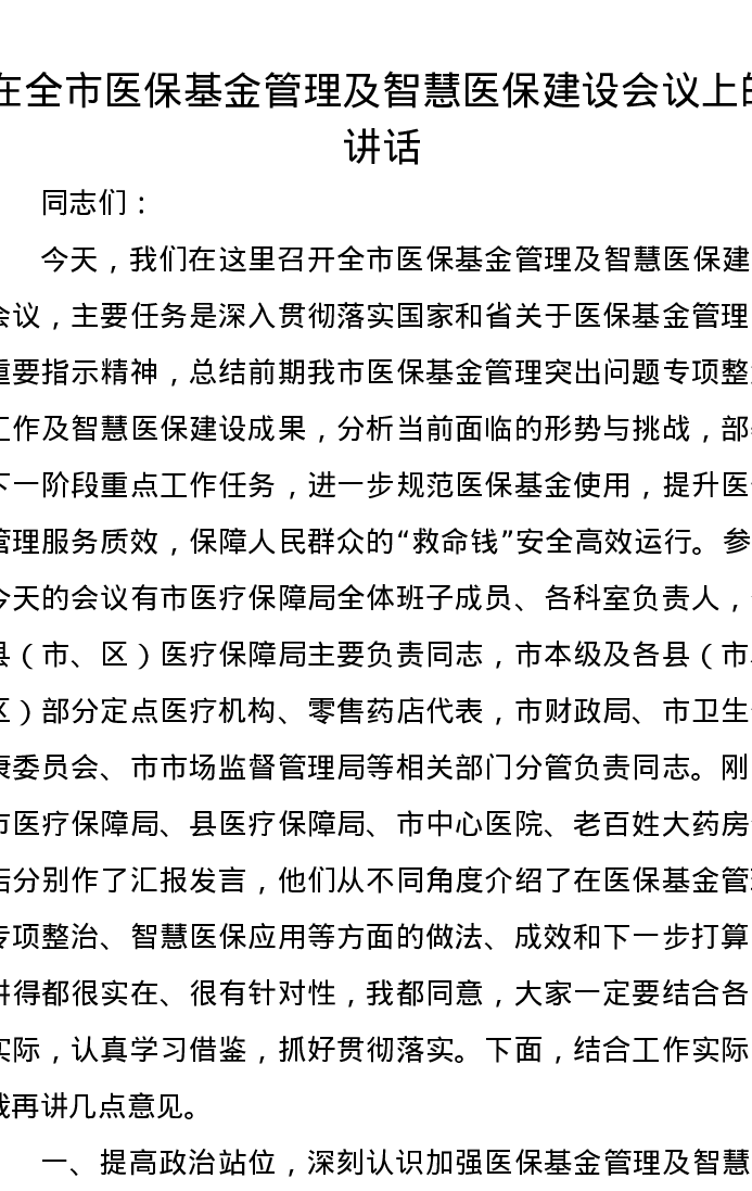 在全市医保基金管理及智慧医保建设会议上的讲话