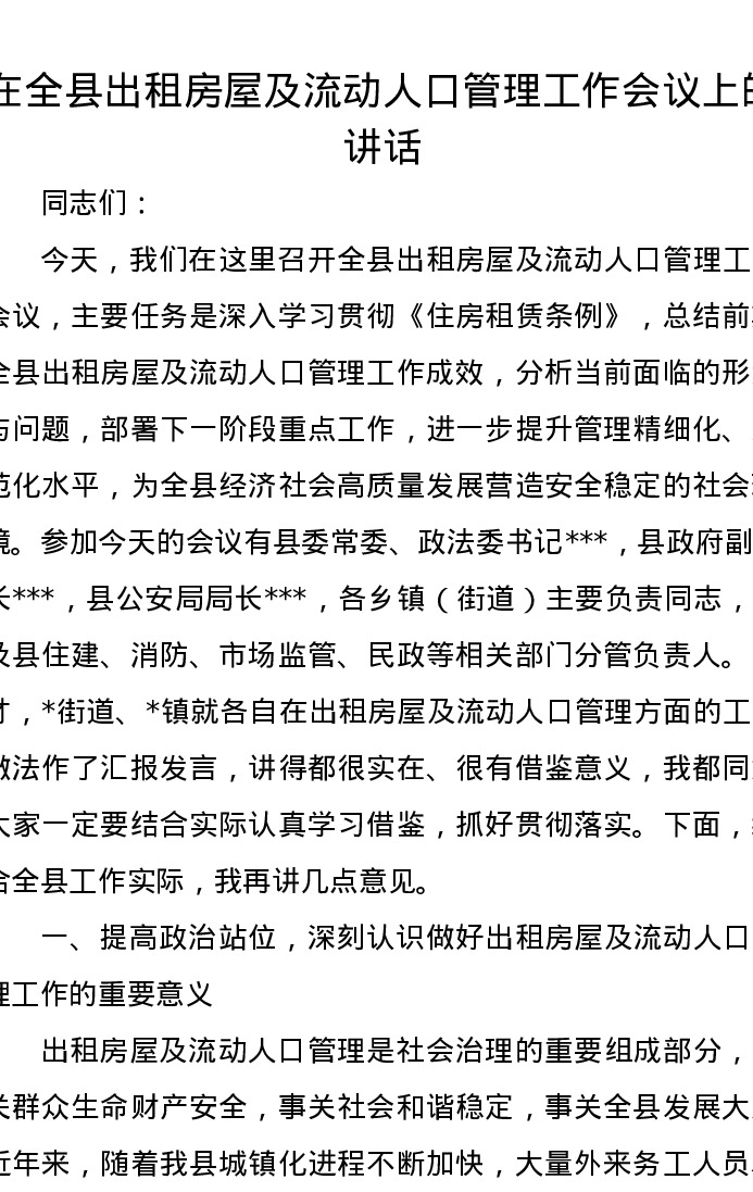 在全县出租房屋及流动人口管理工作会议上的讲话