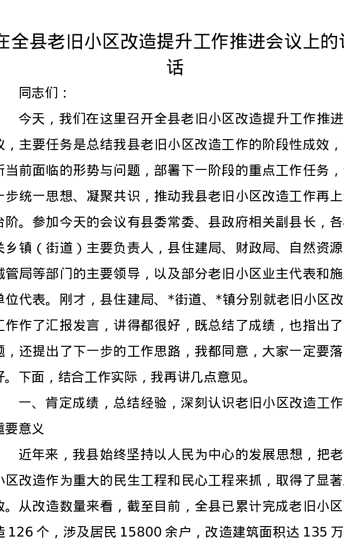 在全县老旧小区改造提升工作推进会议上的讲话