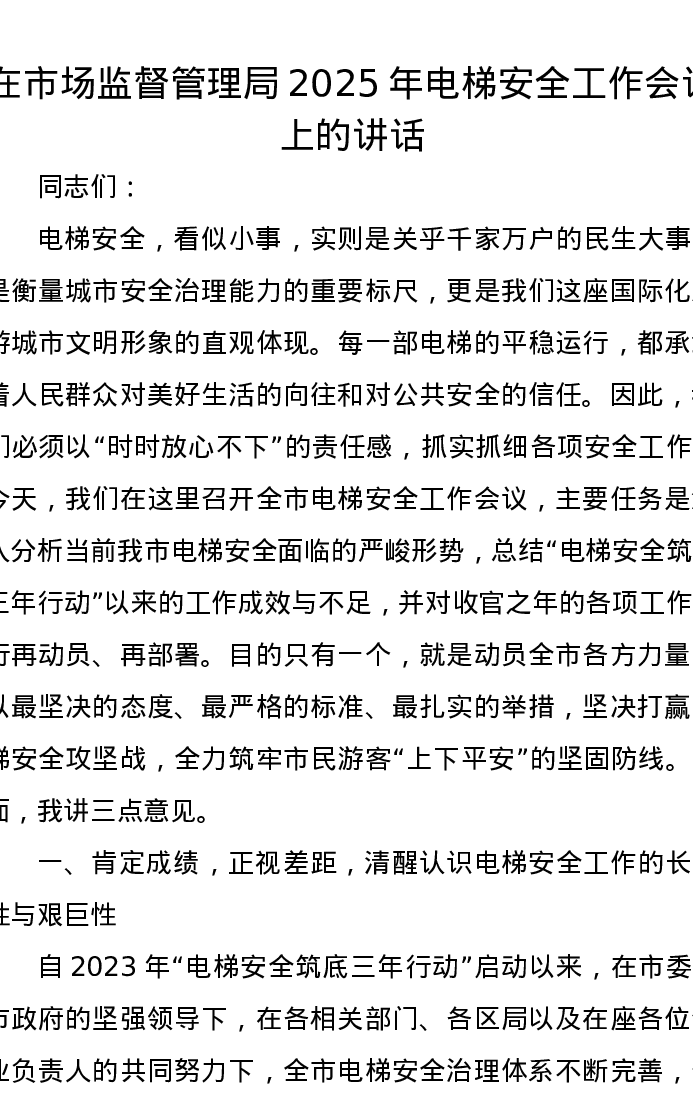 在市场监督管理局2025年电梯安全工作会议上的讲话