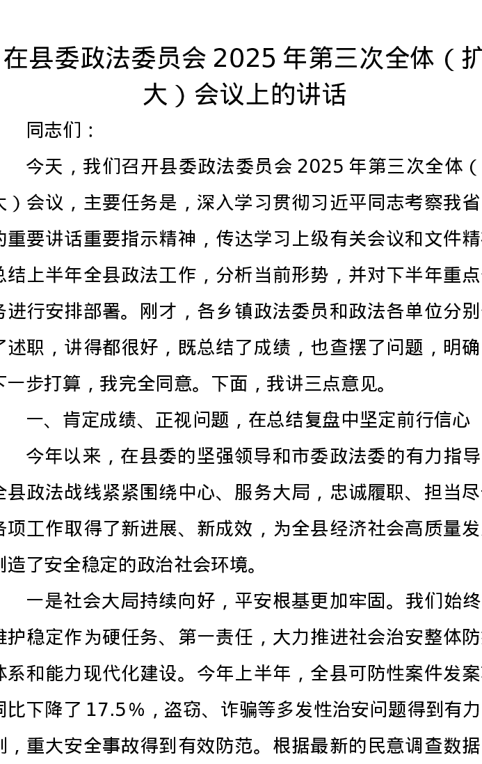 在县委政法委员会2025年第三次全体(扩大)会议上的讲话
