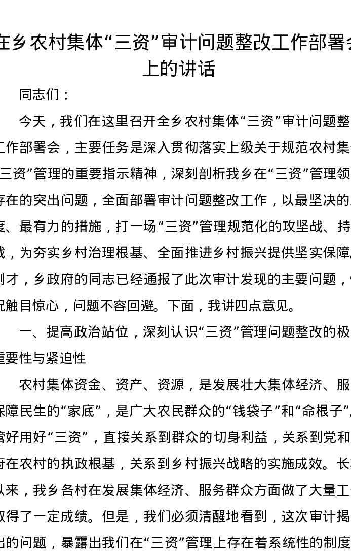 在乡农村集体三资审计问题整改工作部署会上的讲话