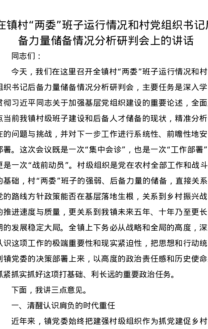在镇村两委班子运行情况和村党组织书记后备力量储备情况分析研判会上的讲话