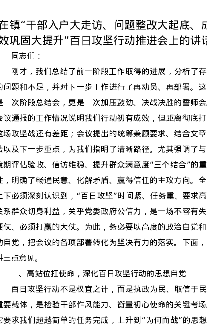 在镇干部入户大走访、问题整改大起底、成效巩固大提升百日攻坚行动推进会上的讲话
