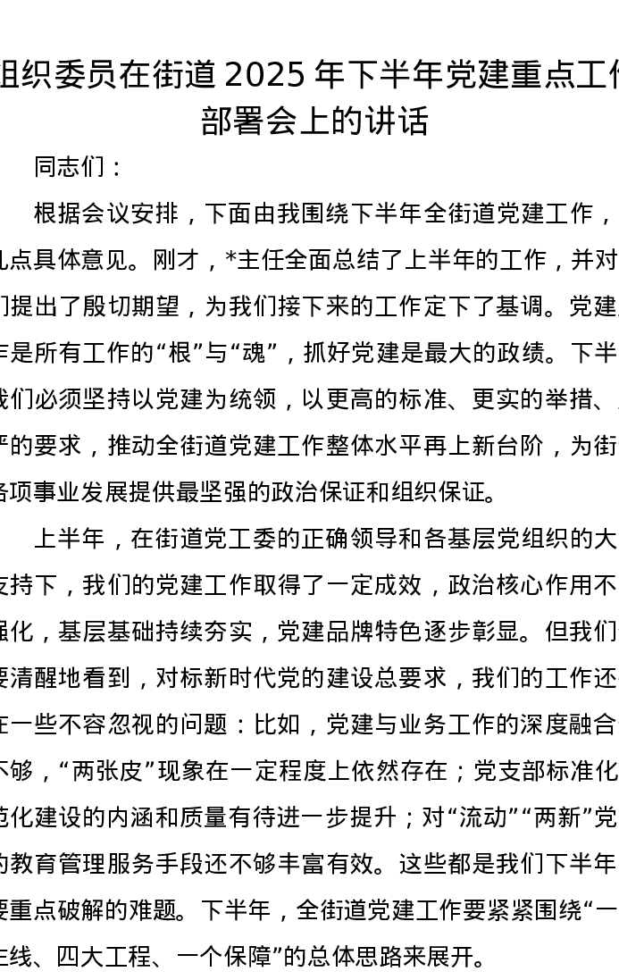 组织委员在街道2025年下半年党建重点工作部署会上的讲话