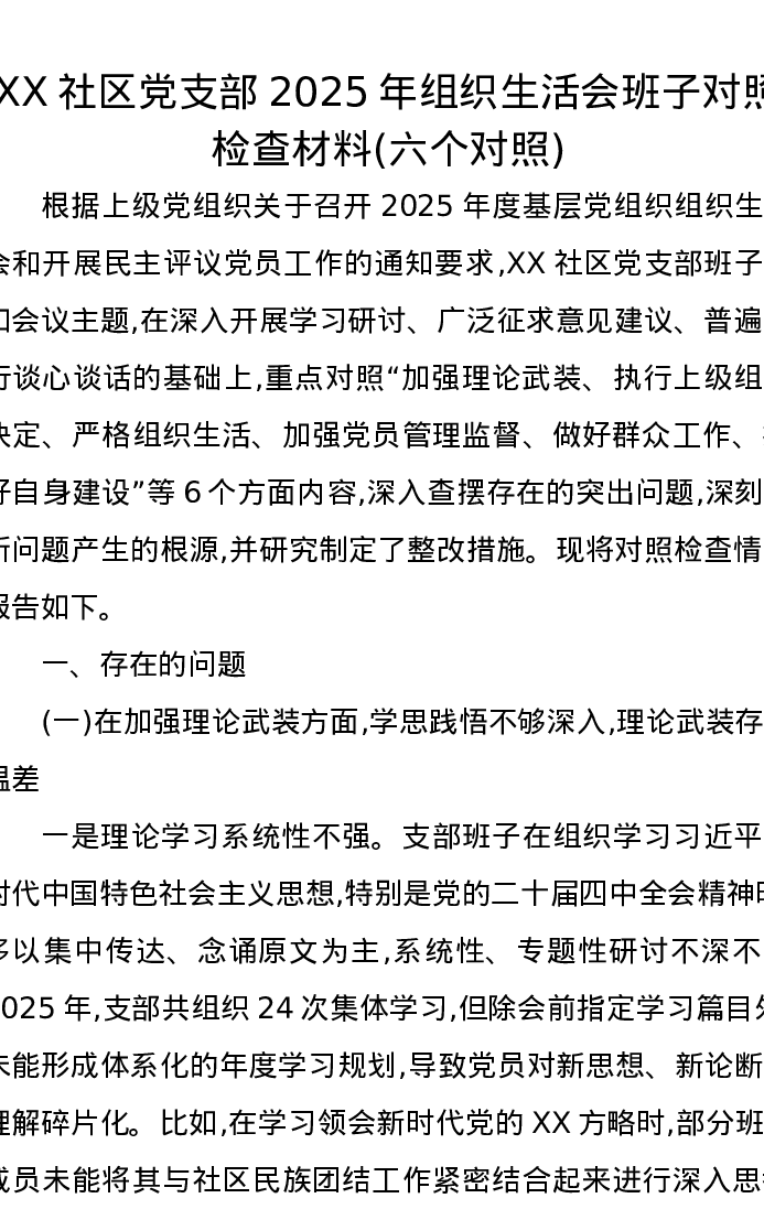 XX社区党支部2025年组织xxx班子对照检查材料(六个对照)
