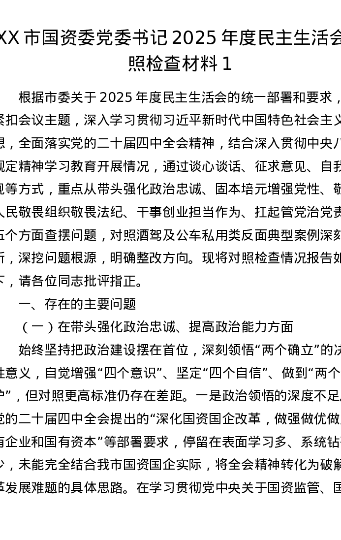 XX市国资委党委书记2025年度xxxxx对照检查材料1