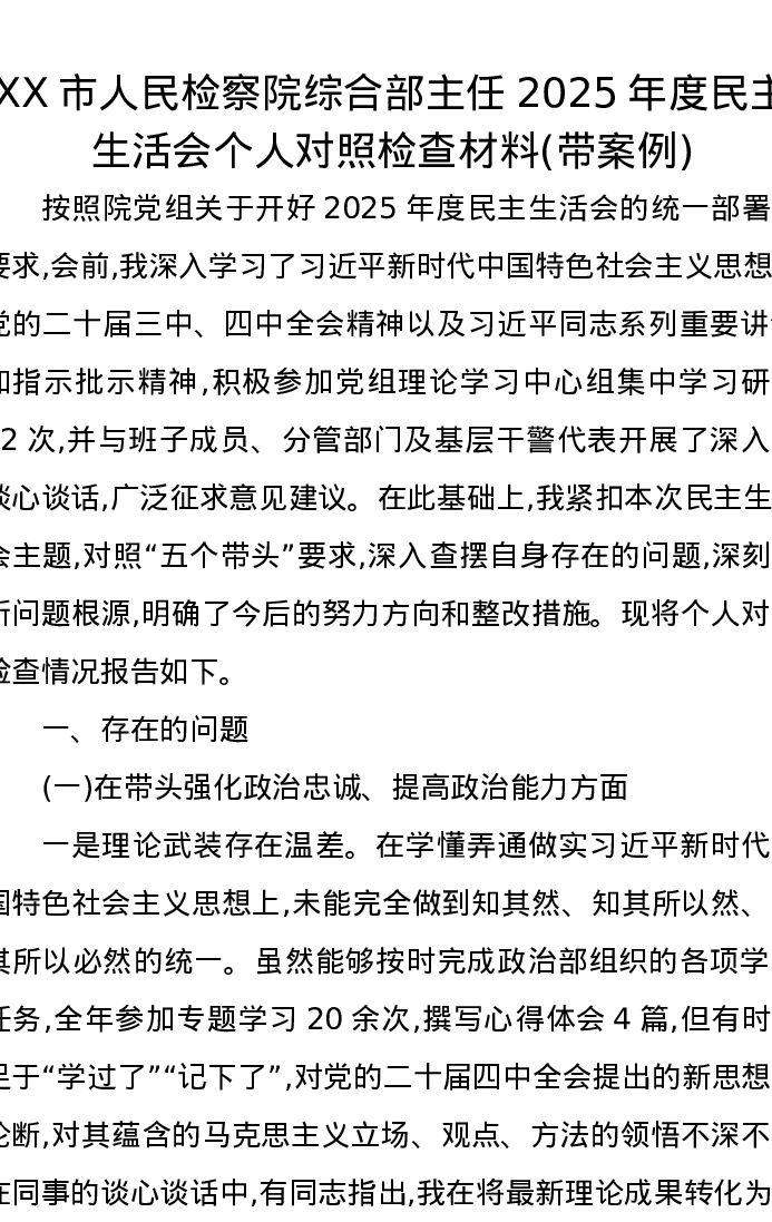 XX市人民检察院综合部主任2025年度xxxxx个人对照检查材料(带案例)
