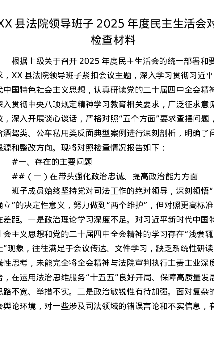 XX县法院领导班子2025年度xxxxx对照检查材料(5937字)