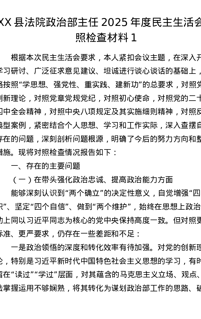 XX县法院政治部主任2025年度xxxxx对照检查材料1