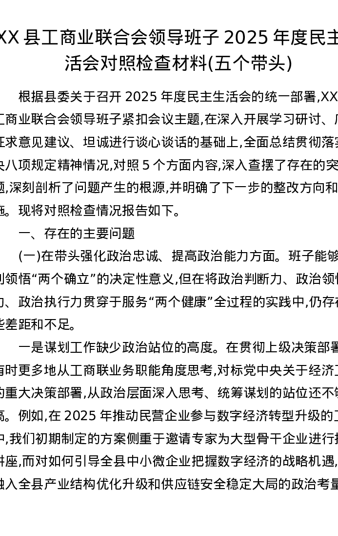 XX县工商业联合会领导班子2025年度xxxxx对照检查材料(五个带头)