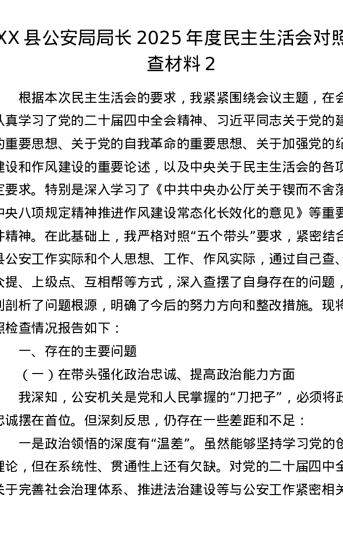 XX县公安局局长2025年度xxxxx对照检查材料2