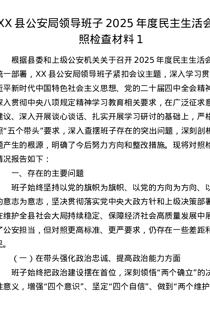 XX县公安局领导班子2025年度xxxxx对照检查材料1