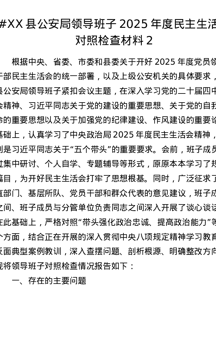 XX县公安局领导班子2025年度xxxxx对照检查材料2