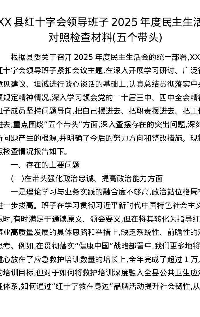 XX县红十字会领导班子2025年度xxxxx对照检查材料(五个带头)