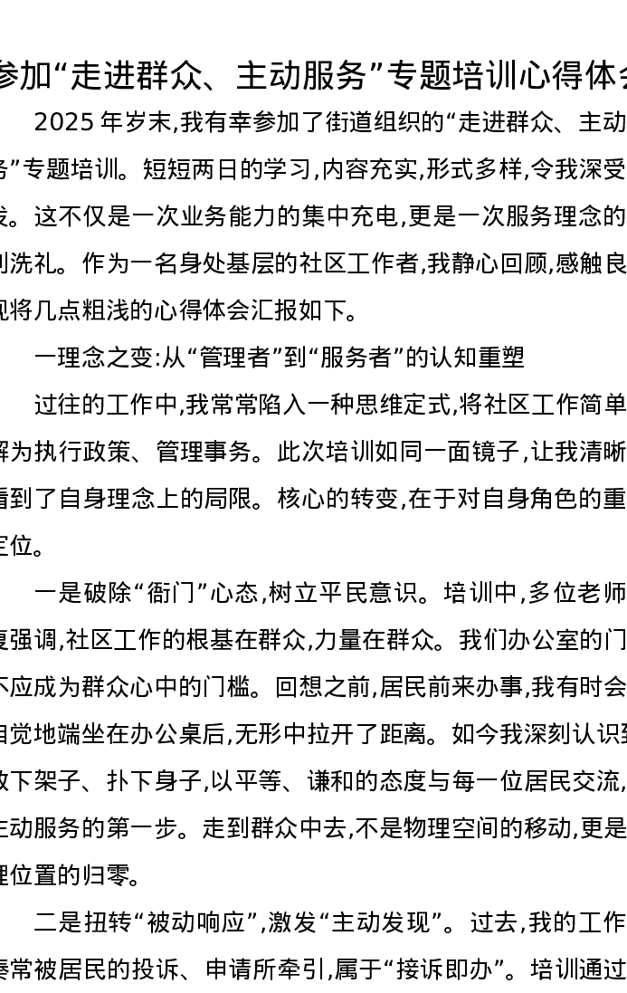 参加走进群众、主动服务专题培训心得体会