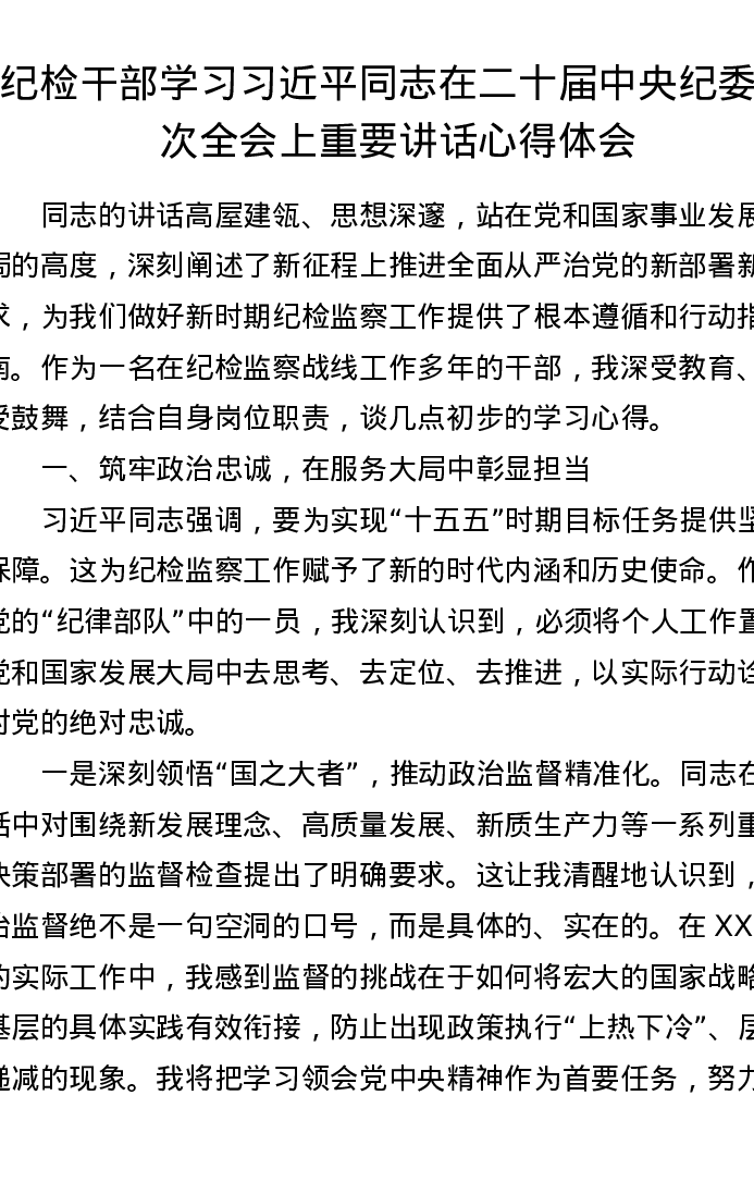 纪检干部学习习近平总书记在二十届中央纪委五次全会上重要讲话心得体会