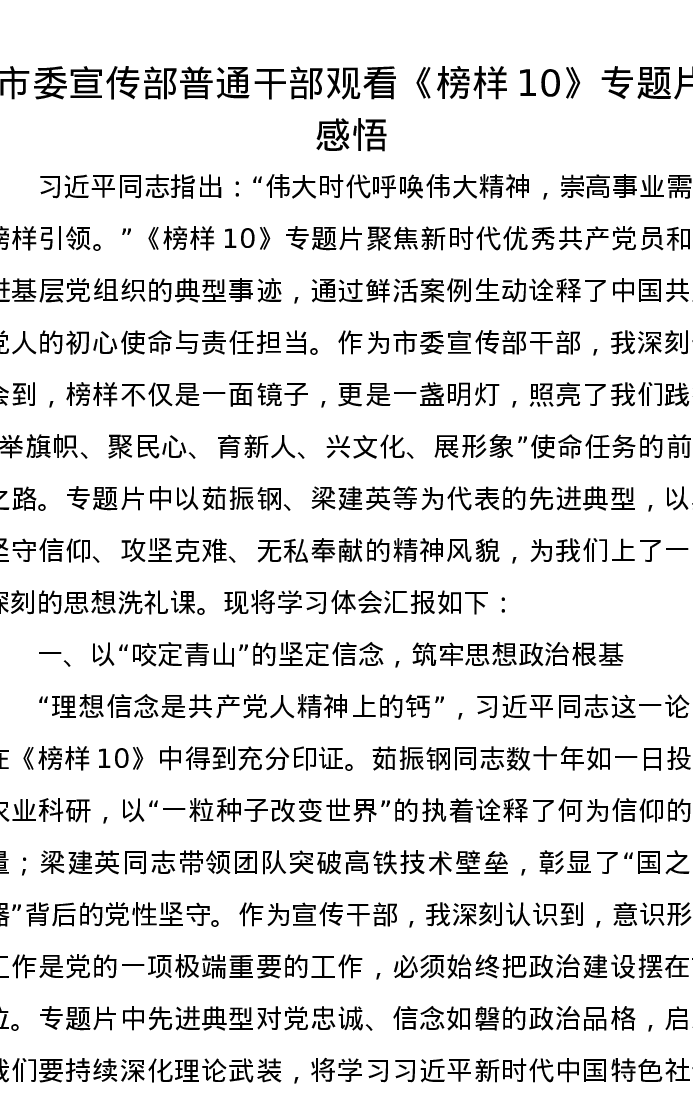 市委宣传部普通干部观看《榜样10》专题片感悟