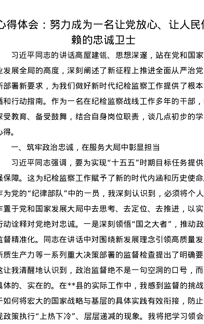 心得体会:努力成为一名让党放心、让人民信赖的忠诚卫士