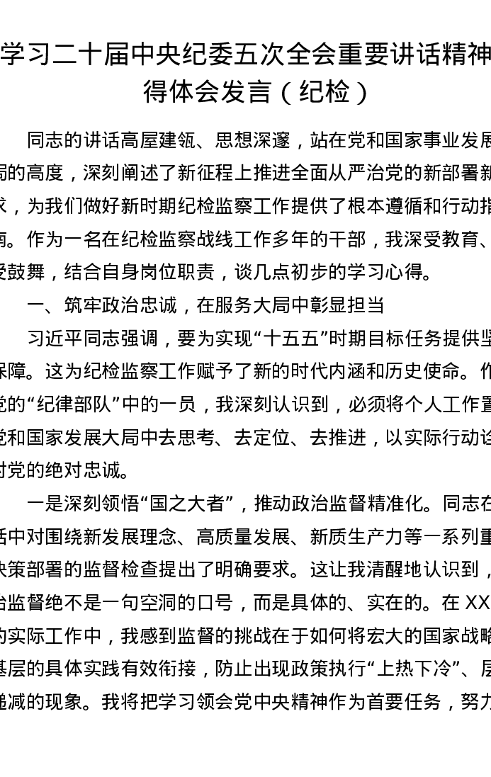 学习二十届中央纪委五次全会重要讲话精神心得体会发言(纪检)